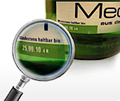 Bei Glasflaschen sind die Angaben zum MHD und der Chargennummer links unten im Etikett eingelasert.